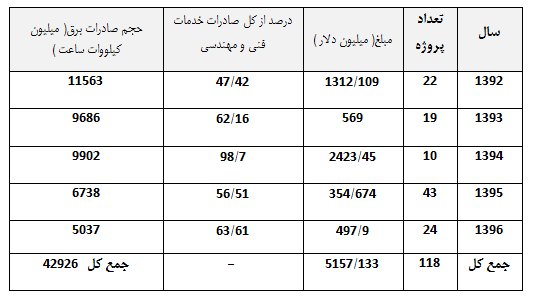 شرکت های فعال صنعت آب و برق در دوره زمانی سال ۱۳۹۲ تا ۱۳۹۶ بیش از پنج میلیارد دلار قرارداد صدور خدمات فنی و مهندسی منعقد کرده اند که این میزان از صادرات خدمات فنی و مهندسی تقریبا ۷۰ درصد صادرات خدمات فنی و مهندسی کشور را پوشش می دهد و در این دوره زمانی حدود ۴.۱ میلیارد دلار صادرات برق نیز صورت پذیرفته است.