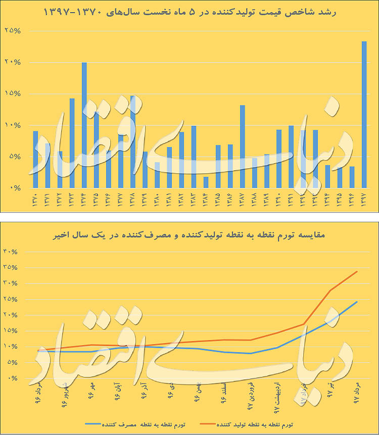 براساس دادههای بانک مرکزی، تغییرات شاخص قیمت تولیدکننده در ۵ ماه ابتدایی سالجاری قله ۲۷ ساله را فتح کرد؛ درحالیکه طی سالهای ۱۳۷۰ تا ۱۳۹۶، بیشترین رشد شاخص تولیدکننده از ابتدای سال تا پایان مردادماه، ۲۰ درصد بود، در سالجاری این عدد به ۴/ ۲۳ درصد ارتقا یافت.