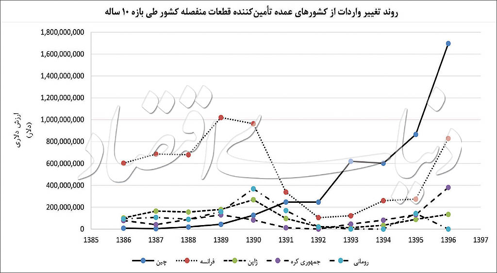 بر این اساس، بیشترین میزان واردات قطعات خودرو به ایران طی بازه زمانی موردنظر، به ترتیب از کشورهای فرانسه (با رقم ۶ میلیارد دلار)، چین (با رقم ۰۶/ ۵ میلیارد دلار)، ژاپن (با رقم ۲۹/ ۱ میلیارد دلار)، جمهوری کره (با رقم ۱۶/ ۱ میلیارد دلار) و رومانی (با رقم ۱۴/ ۱ میلیارد دلار)، بوده است. در این بین، رتبه نخست فرانسویها بهطور مستقیم با تولید محصولات پژوسیتروئن و رنو در ایران طی بازه زمانی موردنظر در ارتباط است. سالهای ۸۶ تا ۹۰ را باید اوج تولید خودروهای فرانسوی در ایران به خصوص در مورد محصولات مربوط به پژوسیتروئن دانست. البته رنو نیز که حضور دوباره در کشور را در سال ۸۶ و با پروژه پلتفرم مشترک X۹۰ کلید زده بود، نقش قابلتوجهی را در صدرنشینی فرانسویها در جدول صادرکنندگان قطعات خودرو به ایران ایفا کرده است. پس از فرانسویها اما چینیها نیز که حضور جدی در ایران را از سال ۸۶ کلید زدند، رده دوم واردات قطعه به کشور را به خود اختصاص دادهاند.