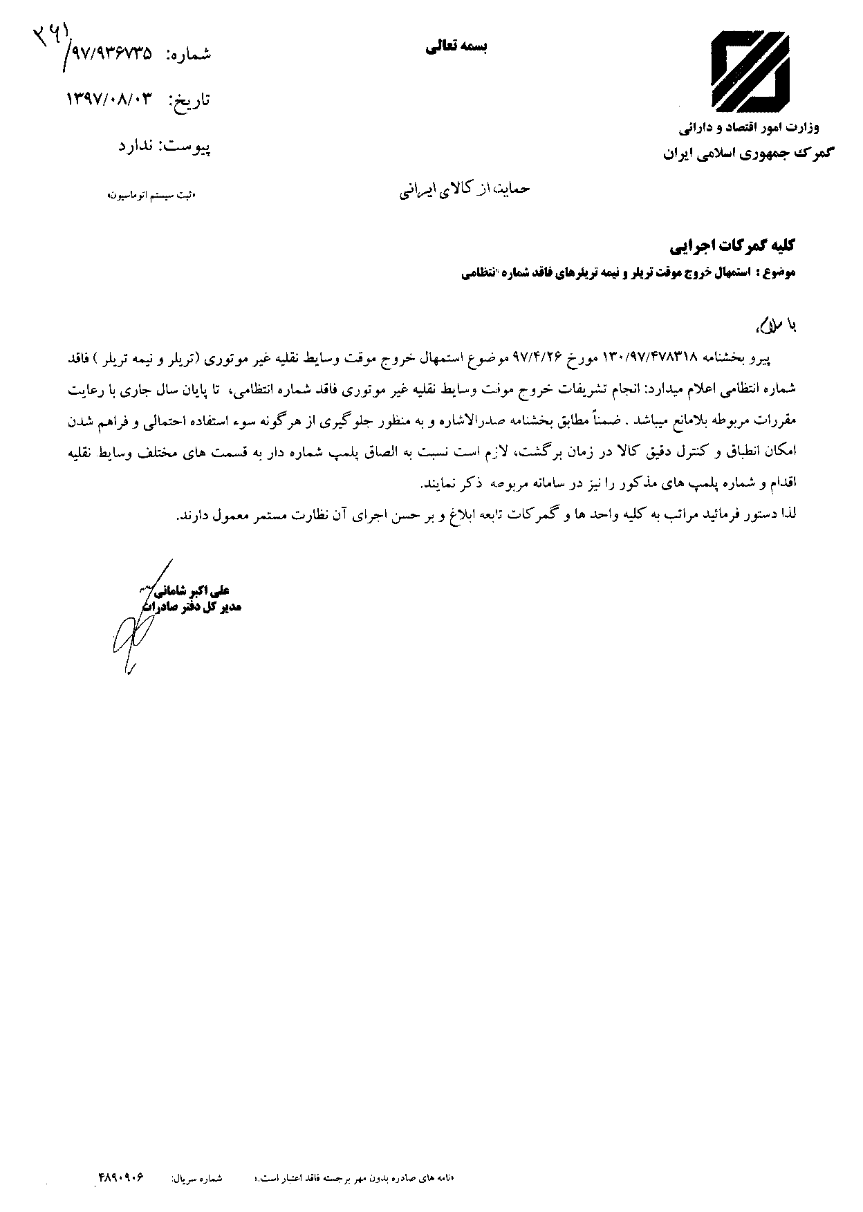 در این بخشنامه آمده است: پیرو بخشنامه ۱۳۰/۹۷/۴۷۸۳۱۸ مورخ ۹۷/۴/۲۶ موضوع استمهال خروج موقت وسایط نقلیه غیرموتوری (تریلر و نیمه تریلر) فاقد شماره انتظامی اعلام می دارد: انجام تشریفات خروج موقت وسایط نقلیه غیرموتوری فاقد شماره انتظامی، تا پایان سال جاری با رعایت مقررات مربوطه بلامانع می باشد. ضمنا مطابق بخشنامه صدرالاشاره و به منظور جلوگیری از هر گونه سواستفاده احتمالی و فراهم شدن امکان انطباق و کنترل دقیق کالا در زمان برگشت، لازم است نسبت به الصاق پلمپ شماره دار به قسمت های مختلف وسایط نقلیه اقدام و شماره پلمپ های مذکور را نیز در سامانه مربوط ذکر نمایند.