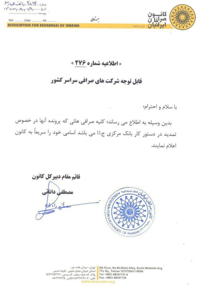 کانون صرافان طی اطلاعیهای اعلام کرد کلیه صرافیهایی که مجوزشان در حال تمدید است اسامی خود را سریعاً به کانون ارسال نمایند.