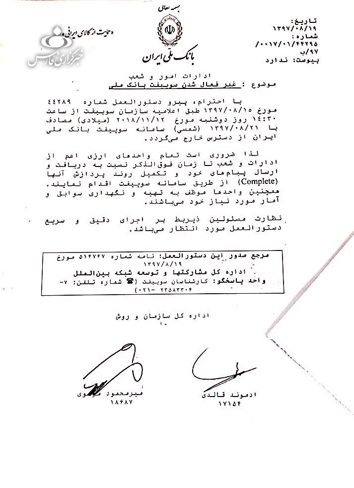 در نامه اداره کل مشارکتها و توسعه شبکه بینالملل بانک ملی آمده است: پیرو دستورالعمل شماره ۴۴۲۸۹ مورخ ۱۳۹۷/۰۸/۱۵ طبق اعلامیه سازمان سوئیفت از ساعت ۱۴:۳۰ روز دوشنبه مورخ ۲۰۱۸/۱۱/۱۲ (میلادی) مصادف با ۱۳۹۷/۰۸/۲۱ (شمسی) سامانه سوئیفت بانک ملی ایران از دسترس خارج میشود.