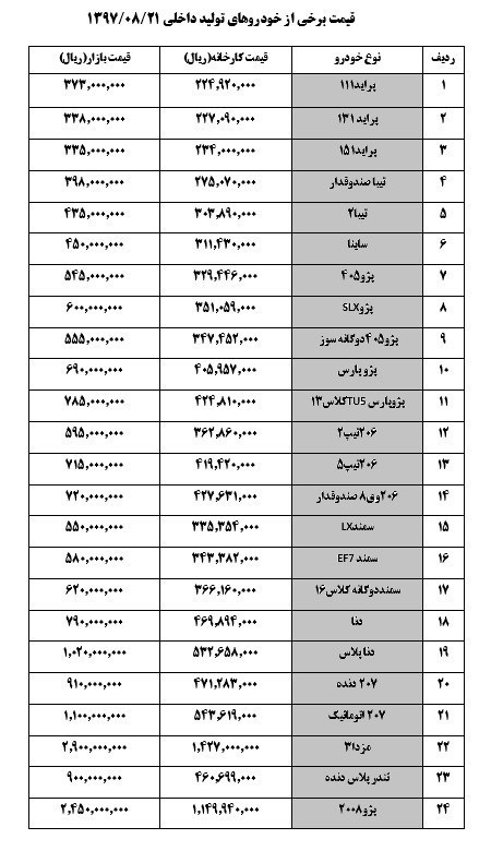 قیمت خودروهای داخلی در بازار امروز به شرح زیر است: