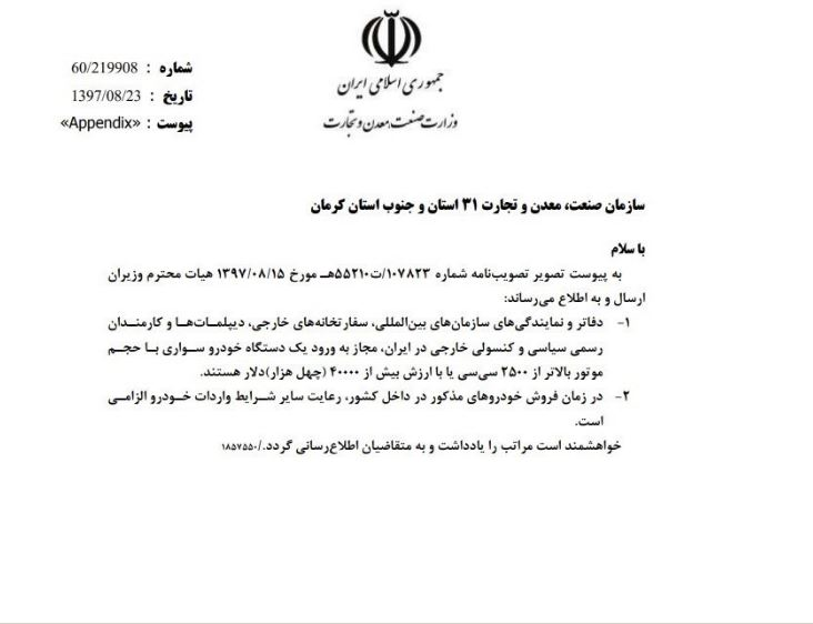 براساس مصوبه هیات وزیران، وزارت صنعت با ارسال نامهای به استانها، شرایط جدید واردات خودرو توسط دیپلماتهای خارجی را اعلام کرد.