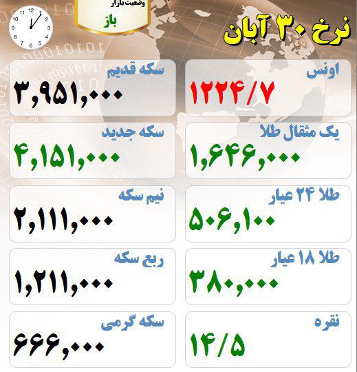 قیمت طلا، قیمت سکه امروز 30 آبان ماه