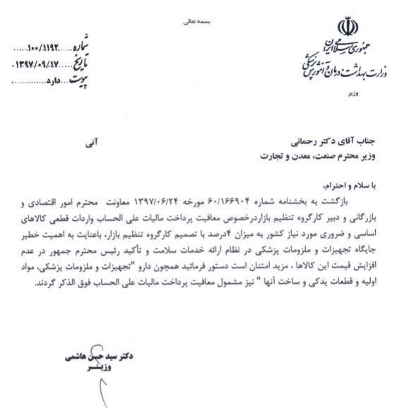 در نامه سیدحسن هاشمی آمده است: بازگشت به بخشنامه شماره 166904/ 60 مورخه 1397/06/24 معاونت محترم امور اقتصادی و بازرگانی و دبیر کارگروه تنظیم بازار درخصوص معافیت پرداخت مالیات علیالحساب واردات قطعی کالاهای اساسی و ضروری مورد نیاز کشور به میزان 4 درصد با تصمیم کارگروه تنظیم بازار، با عنایت به اهمیت خطیر جایگاه تجهیزات و ملزومات پزشکی در نظام ارائه خدمات سلامت و تاکید رئیس محترم جمهور در عدم افزایش قیمت این کالاها، مزید امتنان است دستور فرمایید همچون داور "تجهیزات و ملزومات پزشکی، مواد اولیه و قطعات یدکی و ساخت آنها" نیز مشمول معافیت پرداخت مالیات علیالحساب فوقالذکر گردند.