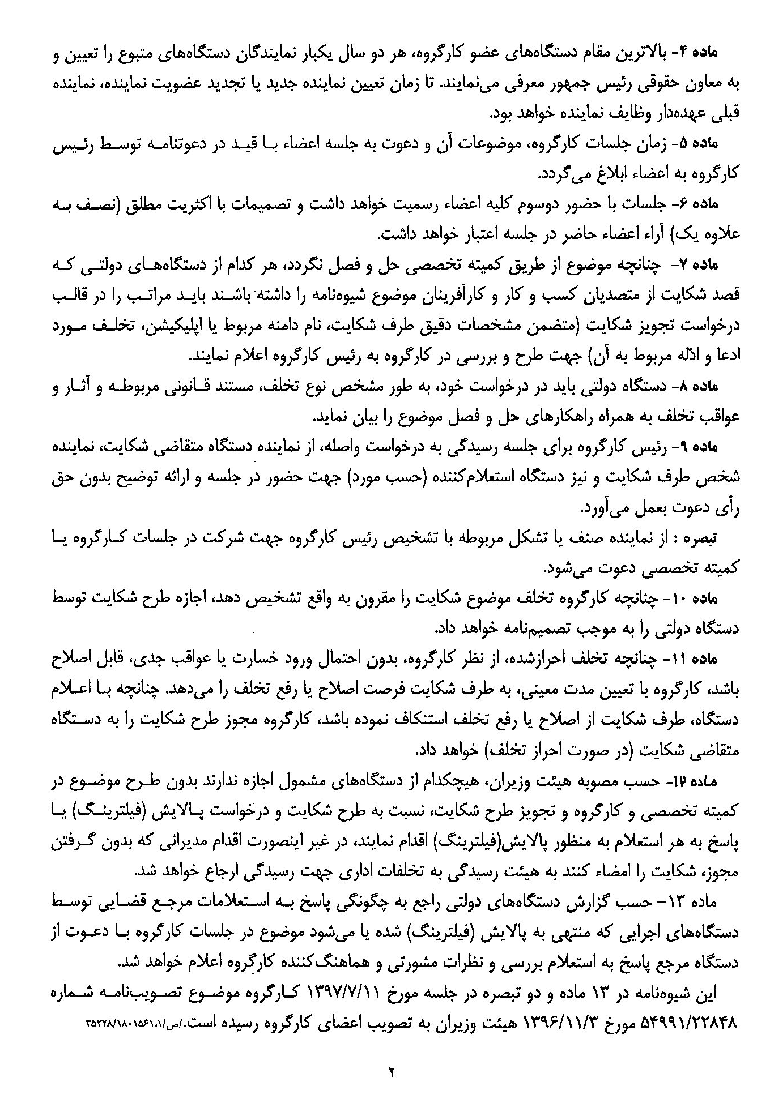چنانچه موضوع از طریق کمیته تخصصی حل و فصل نشود، هر کدام از دستگاههای دولتی که قصد شکایت از متصدیان کسب و کار و کارآفرینان کسب و کارهای مجازی را داشته باشند، باید موضوع را در قالب درخواست شکایت جهت طرح و بررسی در کارگروه، به رئیس کارگروه که معاون حقوقی ریاست جمهوری است، اعلام کند.