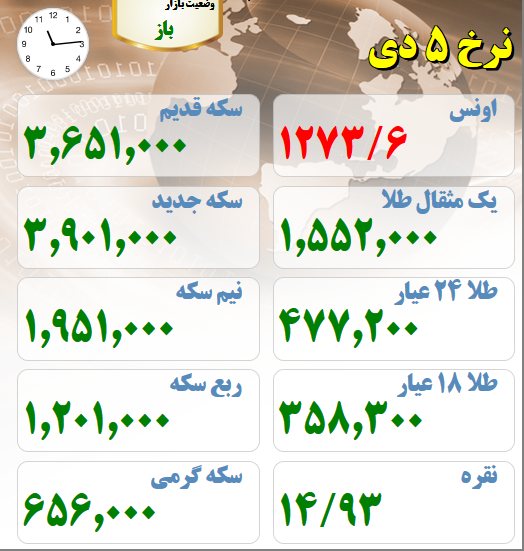 قیمت های بازار طلا و سکه امروز پنجم دیماه
