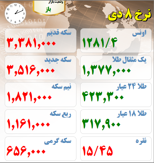 قیمت های بازار طلا و سکه نیمروز هشتم دیماه :