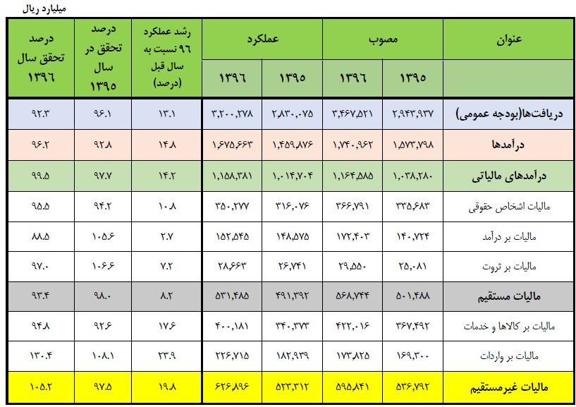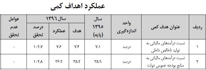 در سال 1396، عملکرد درآمدهای مالیاتی نسبت به هدف برنامه ششم، تحقق حدود 102.7درصد را نشان میدهد و بیش از 36 درصد منابع بودجه عمومی کشور را تأمین کرده است، در حالی که سهم مصوب آن، کمتر از 33.6 درصد بود. ضمن اینکه نسبت به هدف برنامه که 35.2 درصد می باشد بالاتر است و مطلوب ارزیابی می شود.
