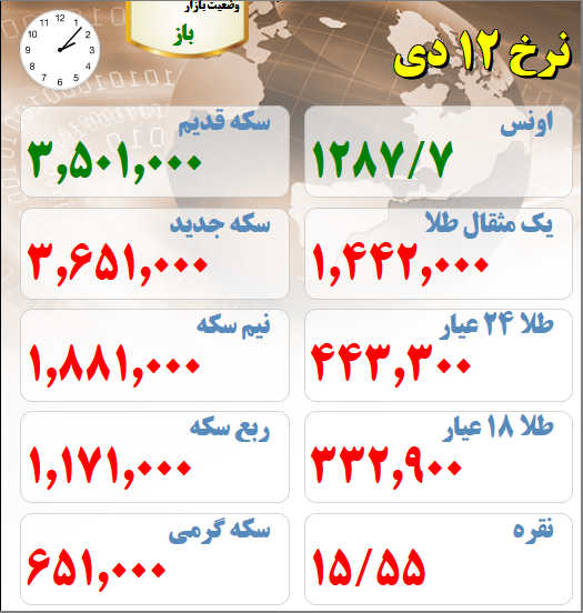 قیمت های بازار طلا و سکه امروز دوازدهم دیماه :