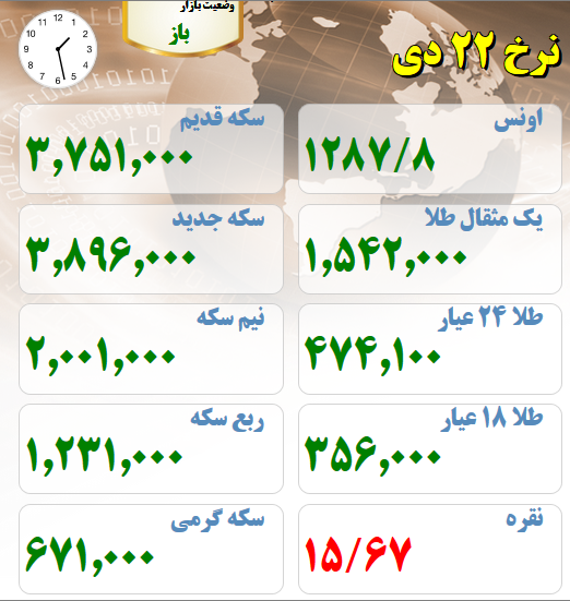 قیمت های بازار طلا و سکه امروز بیست و دوم دیماه
