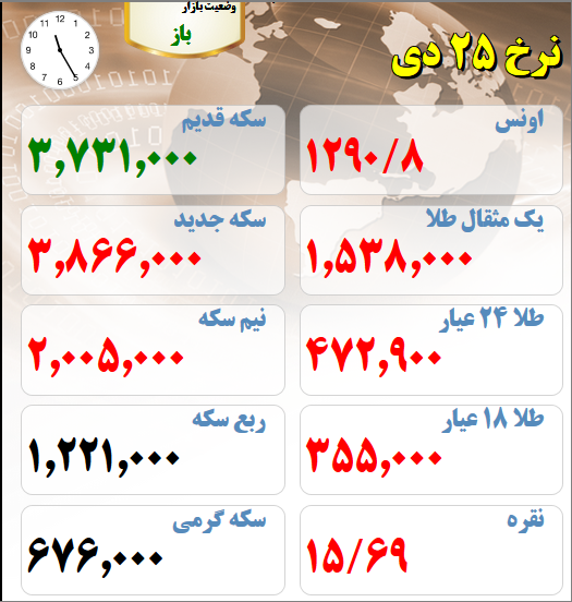 قیمت های بازار طلا و سکه امروز بیست و پنجم دیماه :