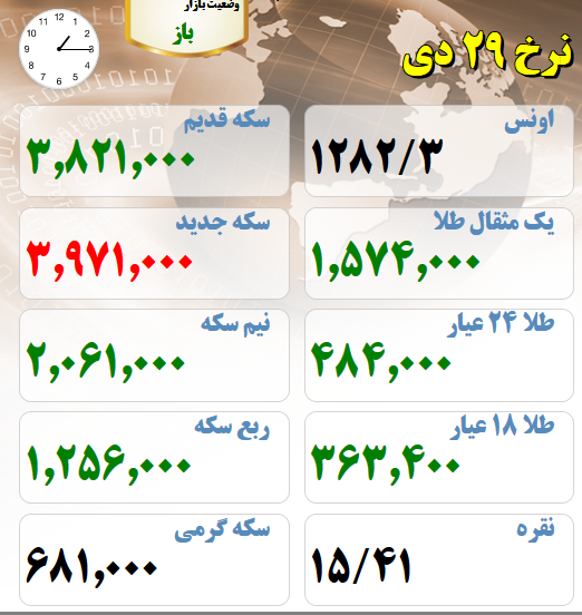 قیمت های بازار طلا و سکه نیمروز بیست و نهم دیماه :