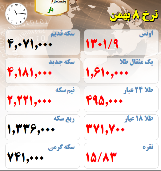قیمت های بازار طلا و سکه امروز هشتم بهمن ماه :