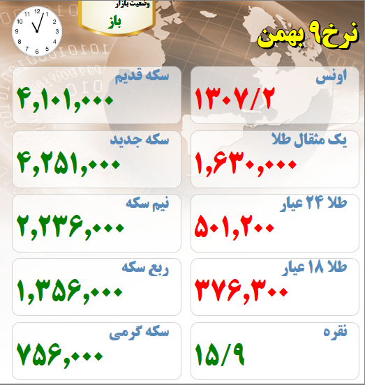 سایت طلا:قیمت طلا و سکه در بازار تهران از اینستاگردی سایت طلا دیدن فرمایید. آخرین مدل ها و مصنوعات طلا و جواهرقیمت های بازار طلا و سکه امروز نهم بهمن ماه :