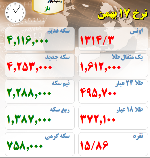 قیمت های بازار طلا و سکه امروز هفدهم بهمن ماه :