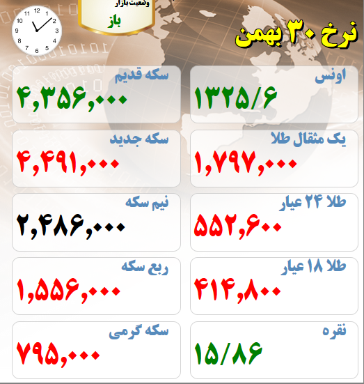 قیمت های بازار طلا و سکه امروز ز سی ام بهمن ماه :