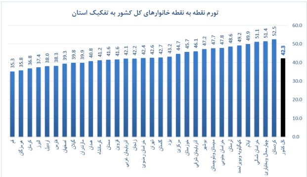 آمارهای نشان میدهد بیشترین نرخ تورم نقطه به نقطه مربوط به استان کردستان (٥٢.٥ درصد) و کمترین آن مربوط به استان قم (٣٥.٣ درصد) است.