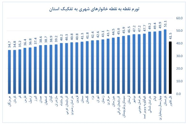 درصد تغییر شاخص کل نسبت به ماه مشابه سال قبل (تورم نقطه به نقطه) برای خانوارهای شهری کشور(٤١,٥ درصد) است. بیشترین نرخ تورم نقطه به نقطه خانوارهای شهری مربوط به استان کردستان (٥١.١ درصد) و کمترین آن مربوط به استان هرمزگان (٣٤.٧ درصد) است، یعنی خانوارهای شهری ساکن استان کردستان به طور متوسط ٩.٦درصد بیشتر از میانگین کل کشور و خانوارهای شهری ساکن استان هرمزگان به طور متوسط ٦.٨ درصدکمتر از میانگین کل کشور نسبت به بهمن ١٣٩٦ برای خرید یک «مجموعه کالا و خدمات یکسان» هزینه کرده اند.