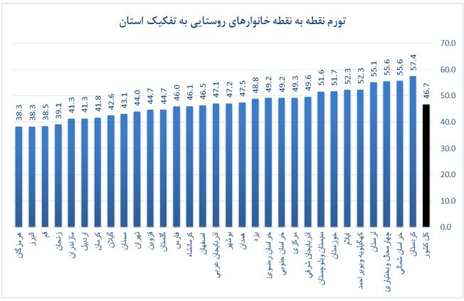 درصد تغییر شاخص کل خانوارهای روستایی نسبت به ماه مشابه سال قبل (تورم نقطه به نقطه) ٤٦.٧ درصد است. بیشترین نرخ تورم نقطه به نقطه خانوارهای روستایی مربوط به استان کردستان (٥٧.٤ درصد) و کمترین آن مربوط به استان هرمزگان (٣٨.٣ درصد) است، یعنی خانوارهای روستایی ساکن استان کردستان به طور متوسط ١٠.٧ درصد بیشتر از میانگین کل کشور و خانوارهای روستایی ساکن استان هرمزگان به طور متوسط ٨.٤ درصد کمتر از میانگین کل کشور نسبت به بهمن ١٣٩٦ برای خرید یک «مجموعه کالا و خدمات یکسان» هزینه کرده اند.