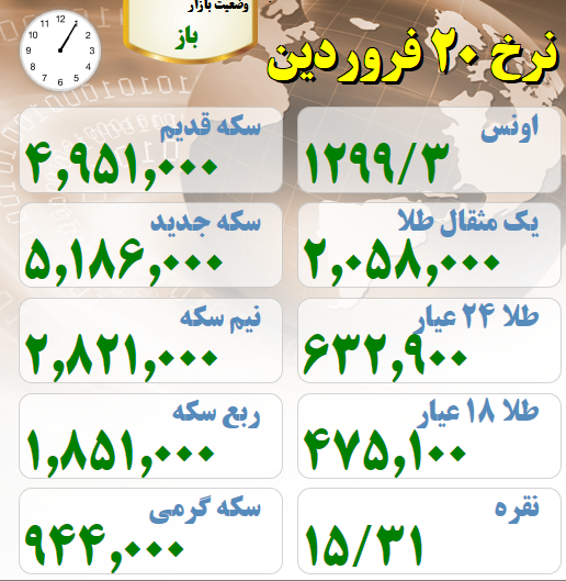 قیمت های بازار طلا و سکه نیمروز بیستم فروردین ماه :