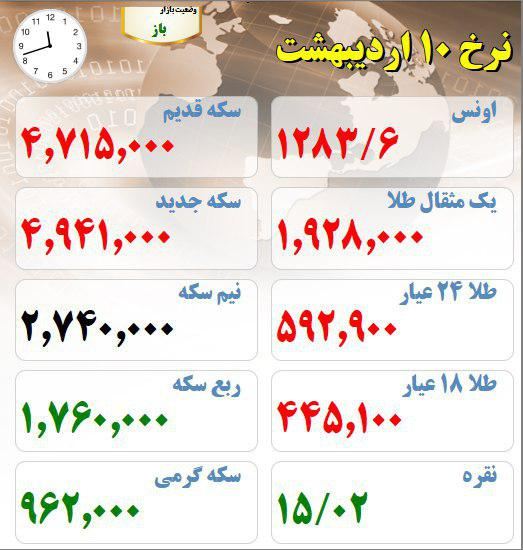 قیمت طلا و سکه 10 اردیبهشت صبح