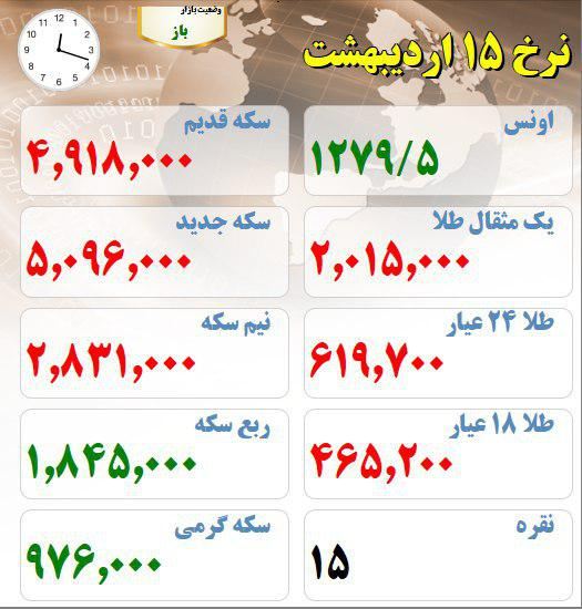 سایت طلا:هر گرم طلای 18 عیار در بازار تهران تا این لحظه 465200 تومان قیمت خورده است.به گزارش سایت طلا قیمت هر سکه تمام بهار در بازار تهران امروز 15 اردیبهشت به بیش از 5 میلیون و 96 هزار تومان رسیده است.سایر قیمت ها به شرح زیر است: