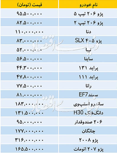 سایت طلا: روزنامه اقتصاد تازه ترین قیمت خودروهای ساخته شده توسط سایپا و ایران خودرو را منتشر کرد. قیمت این خودروها در دوهفته اخیر با اندکی کاهش روبروست.