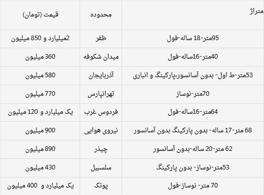 در جدول زیر قیمت واحدهای مسکونی در مناطق مختلف پایتخت آمده است: