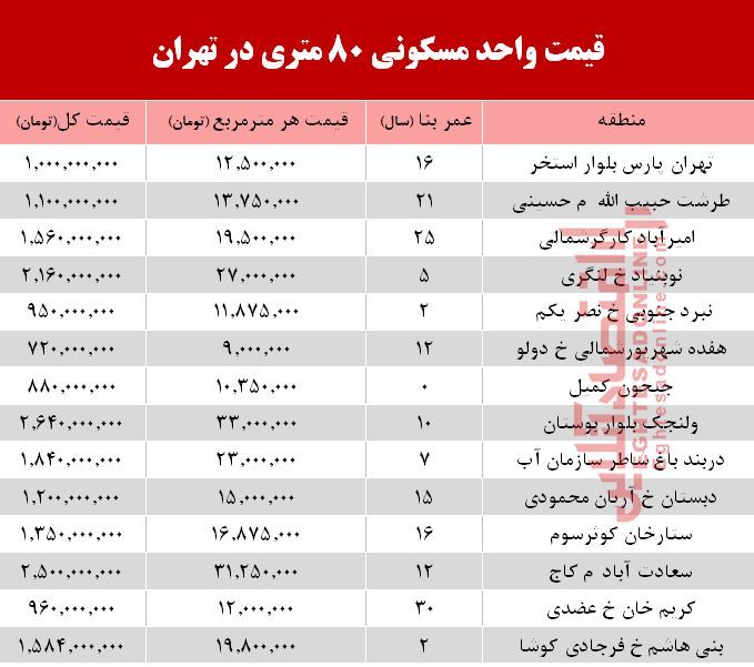سایت طلا:آنچه در زیر میآید جدول قیمت معاملات انجام شده آپارتمان ۸۰متری در مناطق ۲۲گانه شهری تهران طی مهر ماه ۹۸ است.لازم به ذکر است که قیمت آپارتمان های درج شده در این جدول مربوط به اعلام سامانه اطلاعات بازار املاک ایران می باشد.