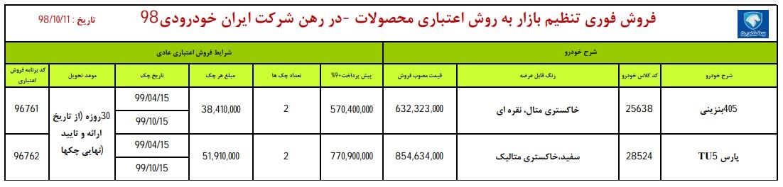 در طرح فروش اقساطی ایران خودرو پژو پارس TU۵ با قیمت ۸۵ میلیون ۴۶۳ هزار ۴۰۰ تومان و با پیش پرداخت ۷۷ میلیون و ۹۰ هزار تومان و پژو ۴۰۵ بنزینی با قیمت ۶۳ میلیون ۲۳۲ هزار و ۳۰۰ تومان و با پیش پرداخت ۵۷ میلیون ۴۰ هزار تومان به فروش میرسد.