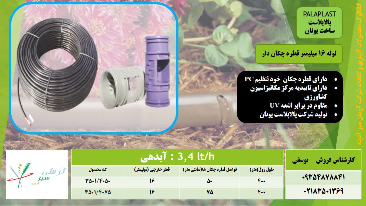 با سلام. لوله 16 میلی متر قطره چکان دار با ابدهی 4 لیتر و قطره چکان خود تنظیم. ساخت یونان با برند پالادریپ. قابل ارائه می باشد.